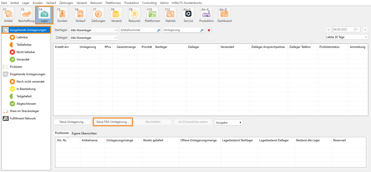 2. Anhand der aktuellen Bestände im FBA-Lager, Ausgangslager und Streckenlager wird die Umlagerungsmenge berechnet.
