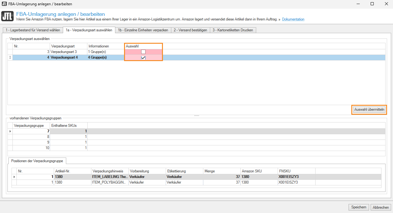 1. Wechseln Sie in die Registerkarte 1a – Verpackungsart auswählen.
