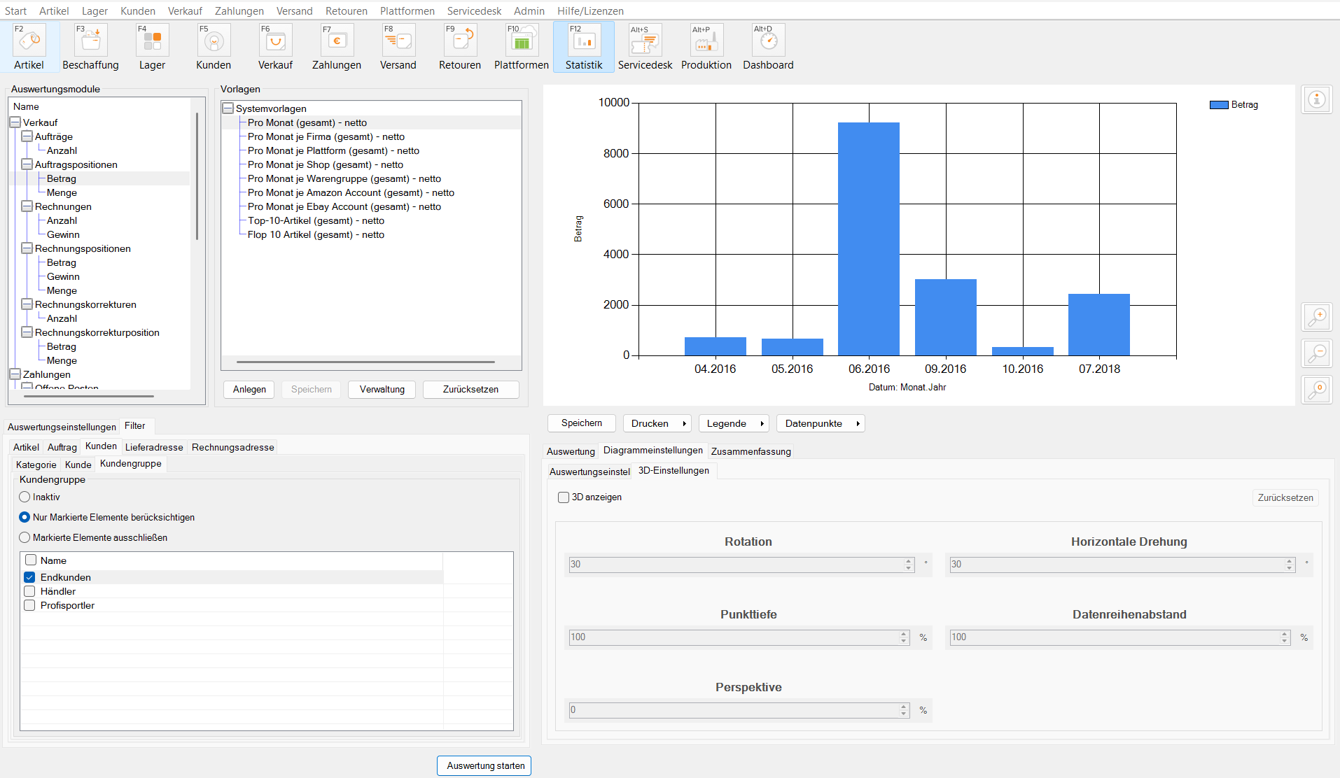 - Markieren Sie im Bereich Auswertungsmodule das Auswertungsmodul. In diesem Beispiel nehmen wir Verkauf > Auftragspositionen > Betrag.