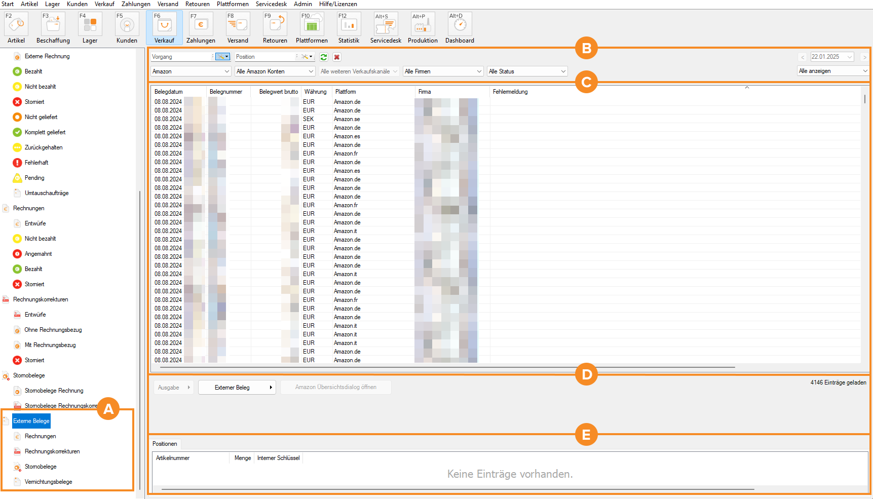Spalte Plattform: Zeigt, über welche Plattform die Bestellung eingegangen ist, auf die sich der externe Beleg bezieht. Zum Beispiel Amazon.de, Amazon.it etc.