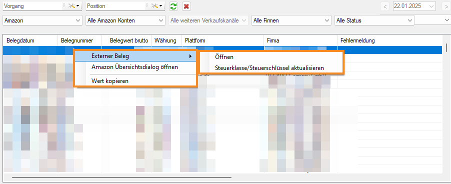 In der Liste sehen Sie alle externen Belege. Per Drag & Drop können Sie die Reihenfolge der Spalten ändern. Mit einem Rechtsklick auf die Spaltenüberschrift können Sie festlegen, welche Spalten angezeigt werden.