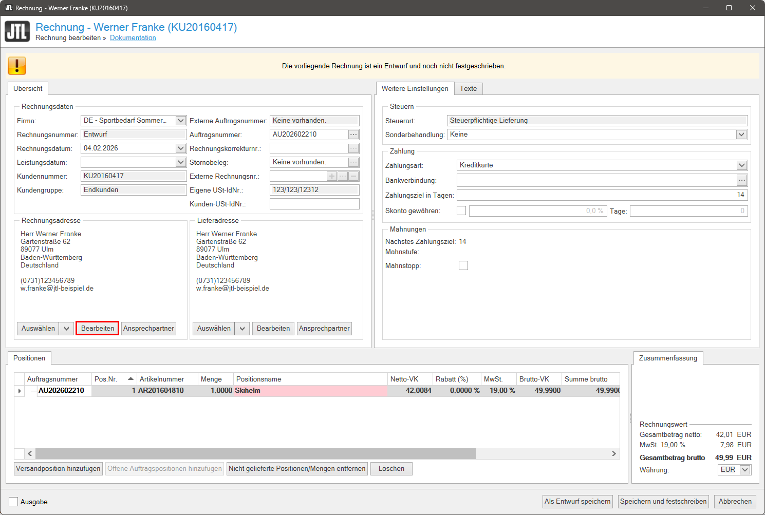 - Sie sehen ein neues Dialogfenster mit den Rechnungsdetails. Die ursprüngliche Rechnung wurde storniert und auf Grundlage der ursprünglichen Rechnung wurde dieser Entwurf erstellt. Ändern Sie die Informationen, die in der ursprünglichen Rechnung falsch waren. In diesem Beispiel ändern wir die Rechnungsadresse über die Schaltfläche Bearbeiten im Bereich Rechnungsadresse.