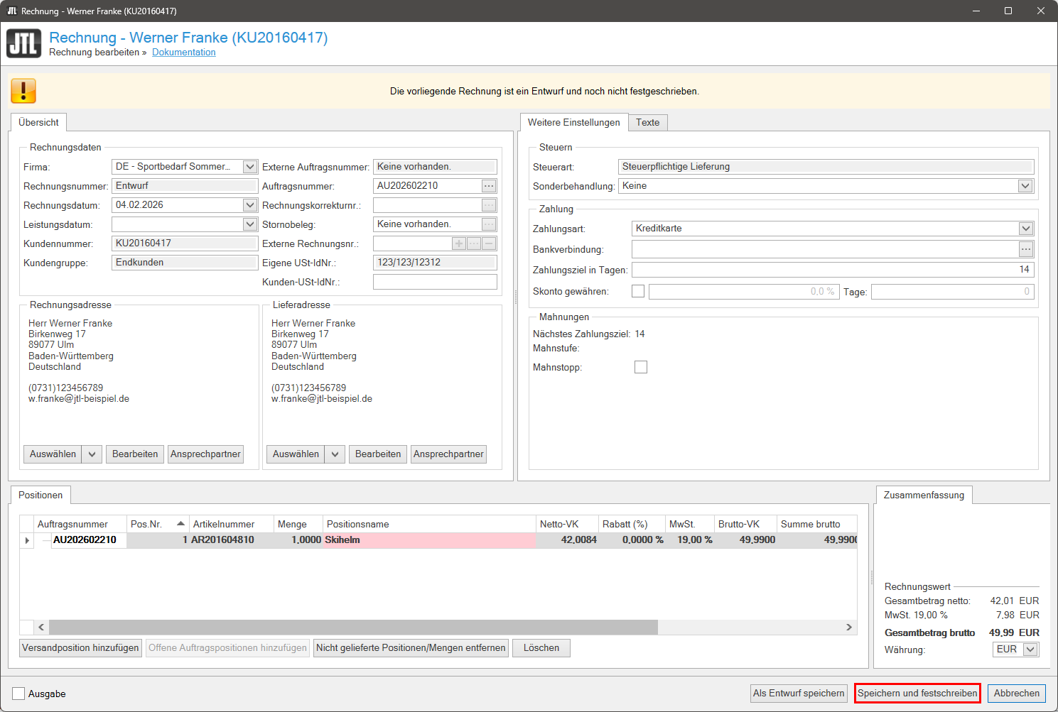 - Lesen Sie die Warnmeldung Rechnung festschreiben und klicken Sie auf die Schaltfläche OK.
