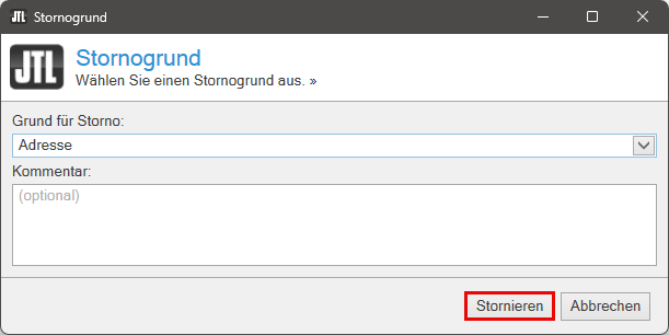 - Im Feld Kommentar können Sie einen Kommentar eingeben. Wenn Sie den Stornogrund Sonstiges gewählt haben, müssen Sie einen Kommentar eingeben.