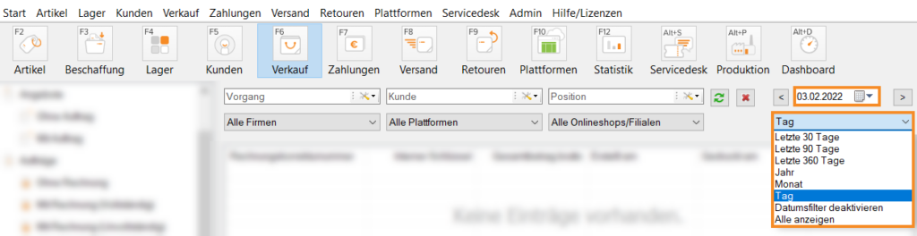 Die Filter teilen sich in drei Bereiche: Suchfelder, Dropdown-Menüs und Datumsbereich.