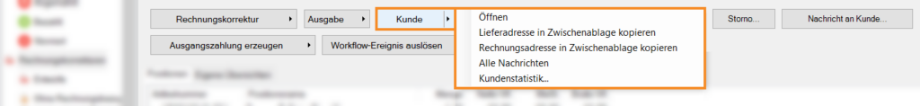 Über den kleinen Pfeil in der Schaltfläche Kunde greifen Sie auf wichtige Funktionen im Zusammenhang mit dem Kunden der Rechnungskorrektur zu.