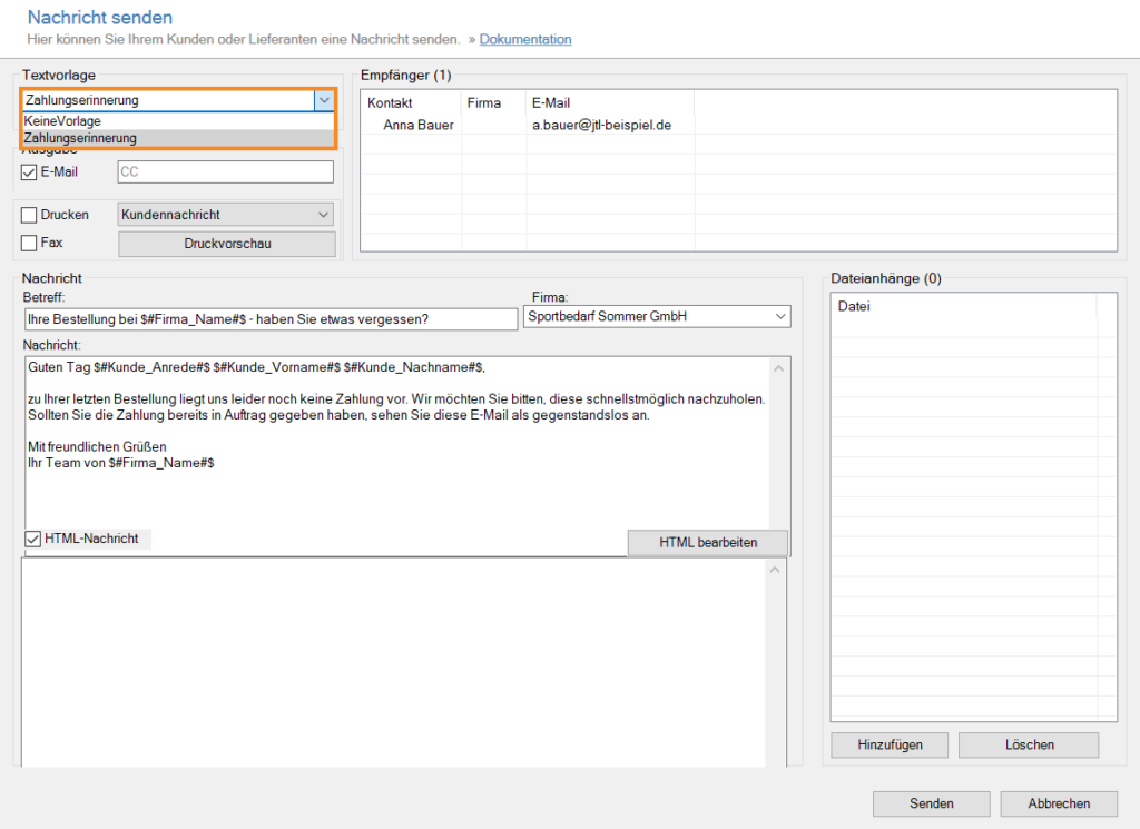 Über die Schaltfläche Nachricht an Kunde können Sie eine E-Mail an den Kunden der markierten Rechnungskorrektur senden. Im Dialogfenster Nachricht senden können Sie aus einer Textvorlage wählen oder eine individuelle Nachricht verfassen. Wie Sie Textvorlagen in JTL-Wawi erstellen können, lesen Sie hier.