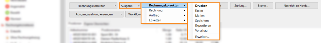 Über die Schaltfläche Rechnungskorrektur erreichen Sie zahlreiche Optionen für die ausgewählte Rechnungskorrektur. Klicken Sie zur Anzeige der Funktionen auf den kleinen Pfeil in der Schaltfläche.
