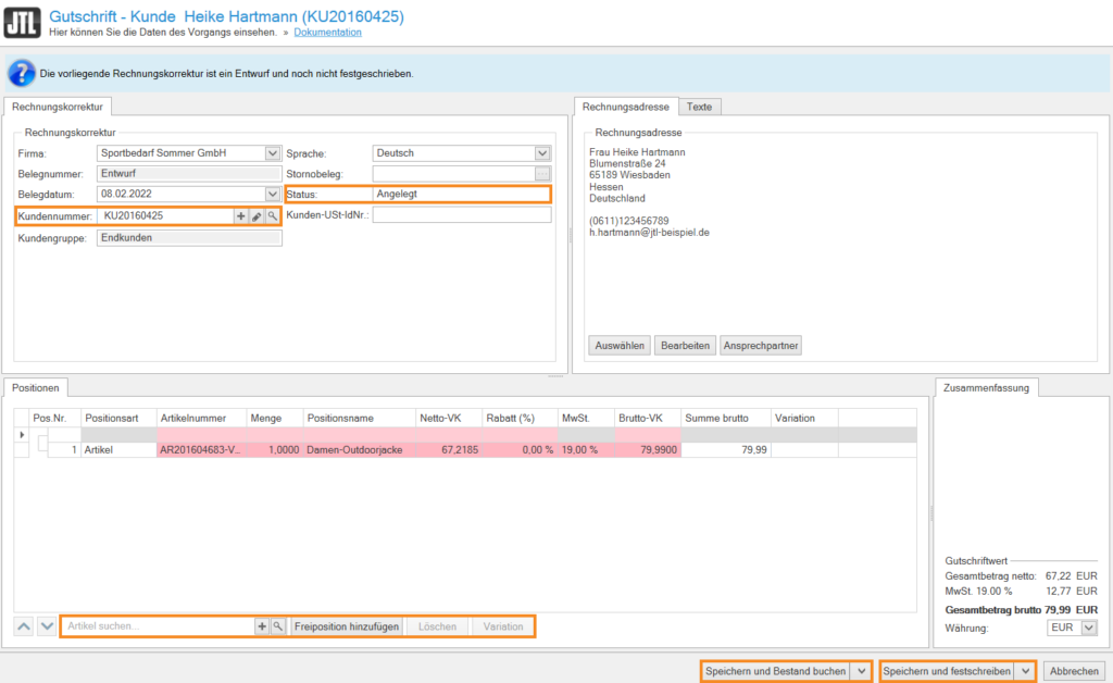 2. Geben Sie über die Artikelsuche die Positionen ein, die in der Gutschrift berücksichtigt werden sollen.