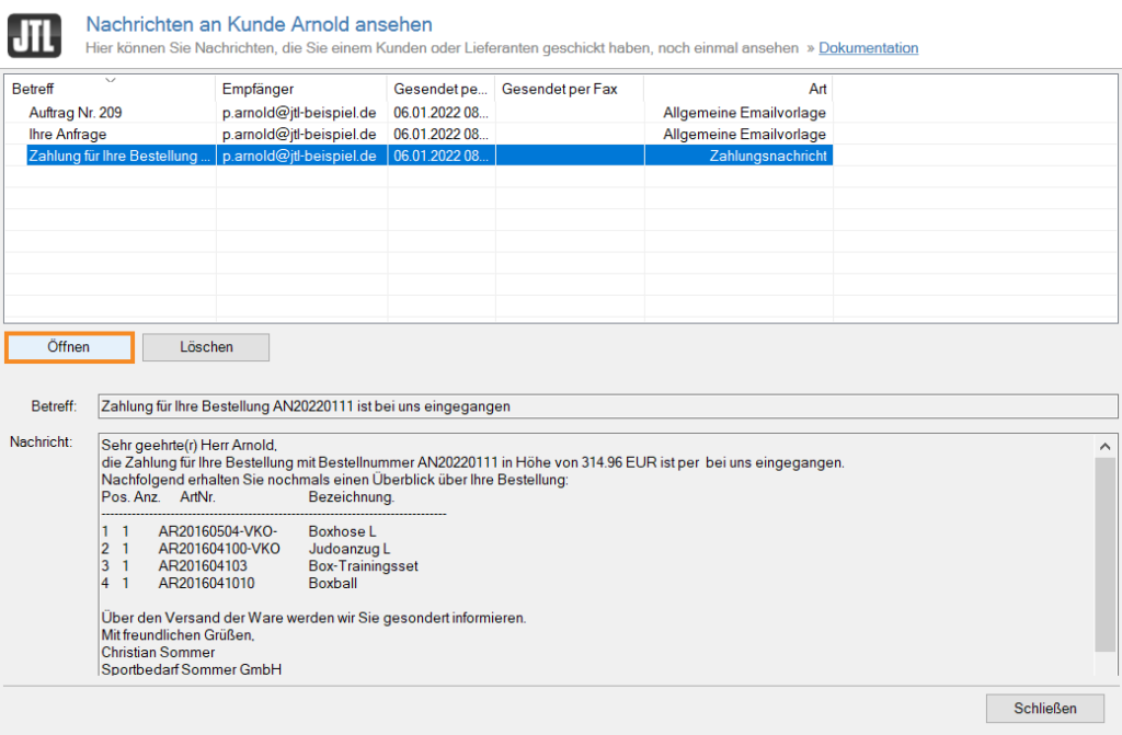 Alle Nachrichten: Zeigt alle Nachrichten, die Sie an den Kunden gesendet haben. Das Fenster Nachrichten an Kunde öffnet sich. Markieren Sie die gewünschte Nachricht und klicken Sie auf die Schaltfläche Öffnen.