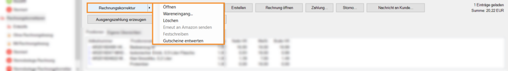 Die Schaltfläche Rechnung öffnen öffnet die Rechnung, auf die sich die markierte Rechnungskorrektur bezieht.