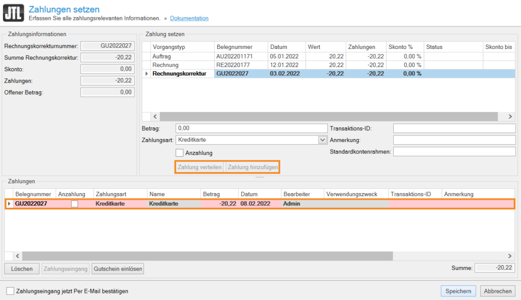 Nachdem Sie eine Zahlung verteilt bzw. hinzugefügt haben, erscheint sie mit Zahlungsart, Betrag, Datum etc. in der Übersicht. Bestätigen Sie mit der Schaltfläche Speichern.