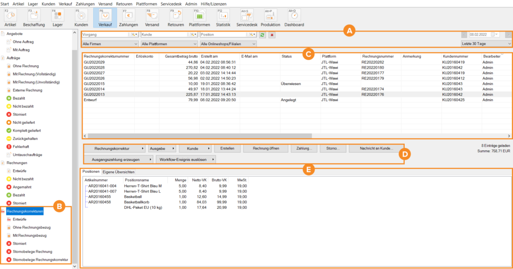 Bereich E: Überblick über die Rechnungskorrekturpositionen