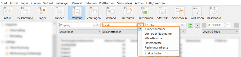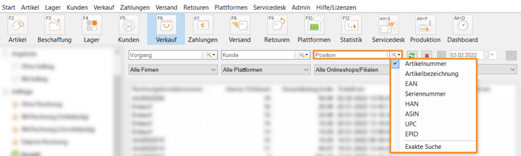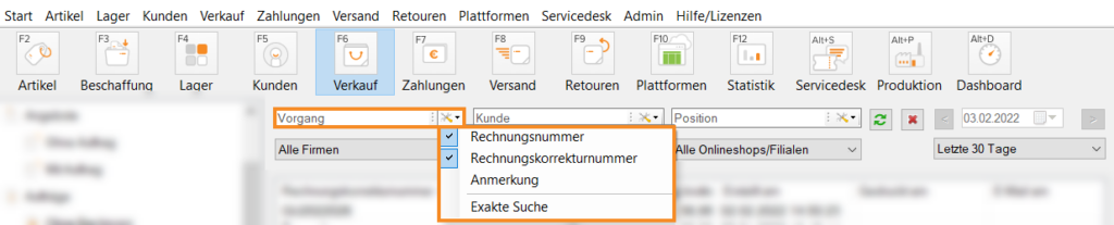 Hinweis: Wenn Sie das Feld Exakte Suche nutzen, müssen Sie beachten, dass Sie genau das Wort bzw. die Nummer in das Suchfeld eingeben müssen, mit der der Name des Vorgangs, Kunden oder der Position beginnt. Beispiel: Sie suchen einen Artikel, von dem Sie genau wissen, dass dessen Name mit “Holz” beginnt. Sie können das Feld Exakte Suche hinzuschalten und dort das Wort “Holz” eingeben. Ihnen werden jetzt alle Artikel angezeigt, die mit diesem Wort beginnen. Wenn Sie jedoch nach einem Artikel suchen, von dem Sie nur wissen, dass das Wort “Holz” zwar im Titel vorhanden ist, sich allerdings nicht an den genauen Namen erinnern können, dann sollten Sie das Feld Exakte Suche nicht verwenden.