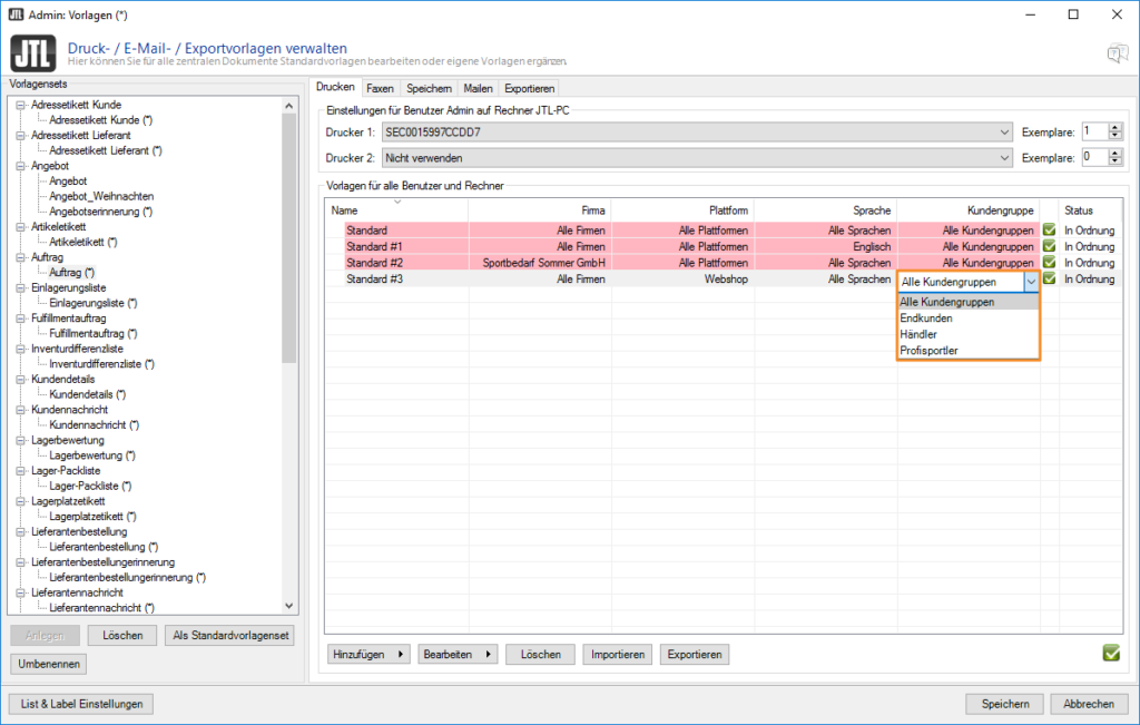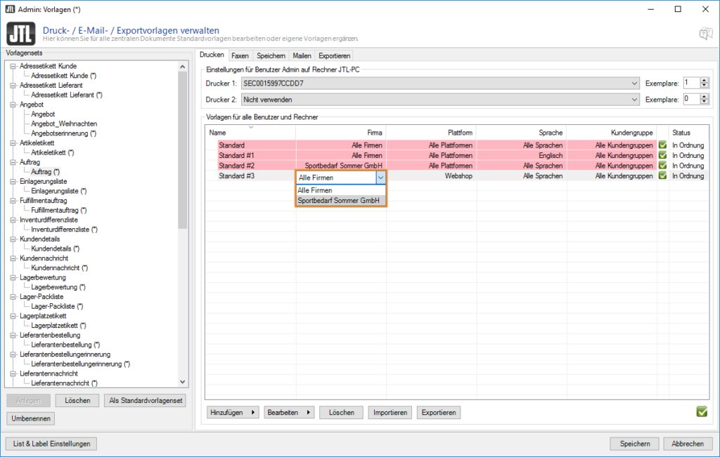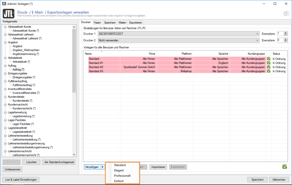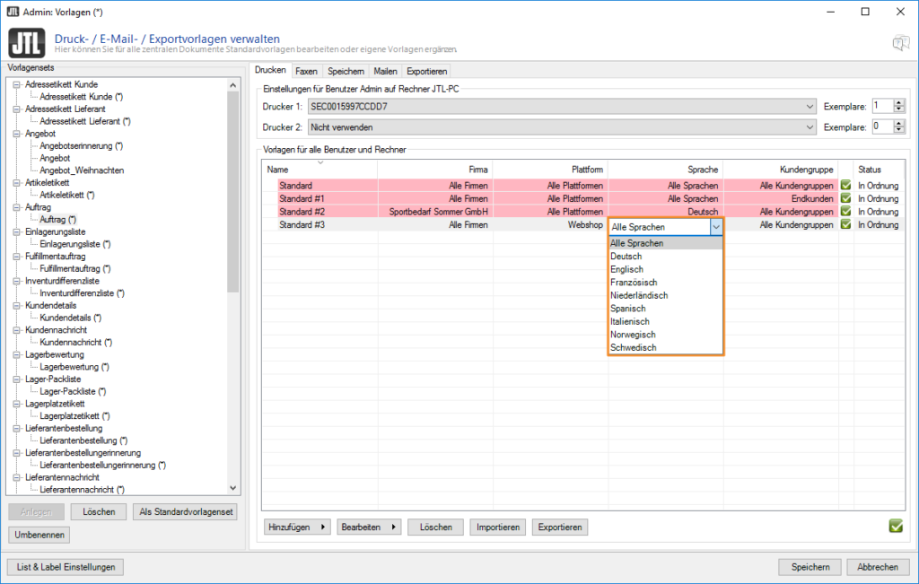 Sie haben bereits ein Vorlagenset in JTL-Wawi angelegt (siehe Vorlagensets erstellen) und möchten nun für dieses Set verschiedene Vorlagen definieren.