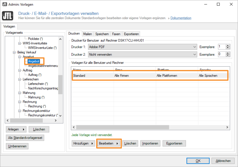 - Öffnen Sie das Dialogfenster Druck-/E-Mail-/Exportvorlagen verwalten über das Menü Admin > Druck-/E-Mail-/Exportvorlagen. Wählen Sie dort das Vorlagenset Beleg: Verkauf > Angebot > Angebot und markieren Sie die Vorlage, die Sie bearbeiten möchten. Klicken Sie anschließend auf Bearbeiten. Es öffnet sich der Formulareditor.