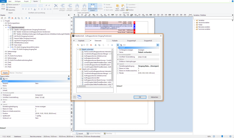 - Wechseln Sie in die Registerkarte Objekte. Doppelklicken Sie auf die Zeile Berichtscontainer. Es öffnet sich das Dialogfenster Tabelleninhalt – Auftragspositionen (Vorgang.Positionen).
