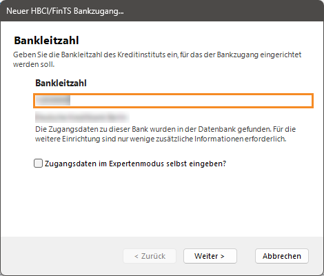 - Geben Sie im neuen Dialogfenster im Feld Bankleitzahl die Bankleitzahl Ihrer Bank ein.