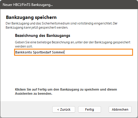 - Geben Sie im neuen Dialogfenster Bankzugang speichern im Feld Bezeichnung des Bankzugangs eine Bezeichnung für die Bank ein. Sie können die Bezeichnung frei wählen.