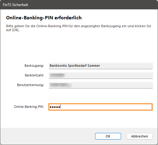 - Sie sehen das neue Dialogfenster Online-Banking-PIN erforderlich. Geben Sie im Feld Online-Banking-PIN Ihre PIN für das Online-Banking ein.