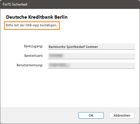 - Sie sehen das neue Dialogfenster Bankzugang synchronisieren…. Nachdem die ersten Schritte zur Synchronisierung automatisch durchlaufen sind, sehen Sie entweder das neue Dialogfenster FinTS Sicherheit oder FinTS TAN-Verfahren. Welches Dialogfenster Sie sehen, hängt von Ihren Bankeinstellungen ab: