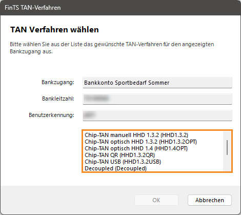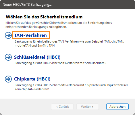 Hinweis: In dieser Anleitung wird die Anbindung mit dem Sicherheitsmedium TAN-Verfahren erklärt. Das TAN-Verfahren entspricht dem aktuellen Standard und ist das am häufigsten verwendete Sicherheitsmedium. Die Sicherheitsmedien Schlüsseldatei (HBCI) und Chipkarte (HBCI) sind veraltet und werden von den meisten Banken nicht mehr angeboten.