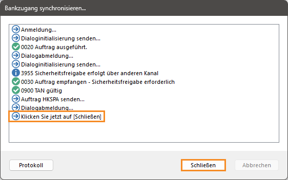 - Sie gelangen zurück zum Dialogfenster Bankzugang synchronisieren…. Sie sehen, dass weitere Schritte zur Synchronisierung automatisch durchlaufen werden. Sobald die Synchronisierung abgeschlossen ist, sehen Sie als letzten Schritt die Aufforderung Klicken Sie jetzt auf [Schließen]. Klicken Sie dann auf die Schaltfläche Schließen.