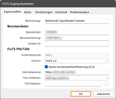 - Sie sehen das neue Dialogfenster FinTS-Zugang bearbeiten. Klicken Sie auf die Schaltfläche OK.