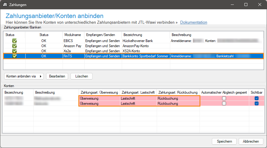 - Sie gelangen zurück zum Dialogfenster Zahlungsanbieter/Konten anbinden. Wählen Sie in der Tabelle Zahlungsanbieter/Banken die Bank aus, die Sie via FinTS angebunden haben.