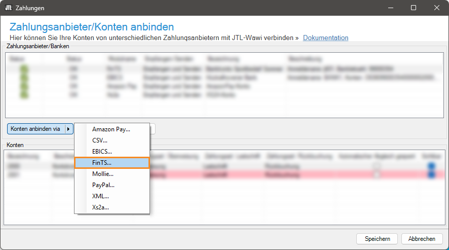 - Öffnen Sie über das Menü Zahlungen > Zahlungsanbieter das Dialogfenster Zahlungsanbieter/Konten anbinden.