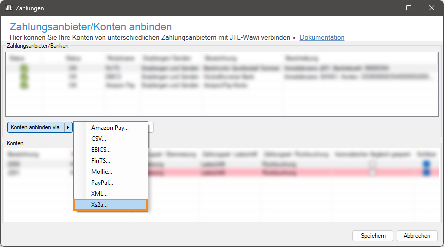 - Klicken Sie auf die Schaltfläche Konten anbinden via (Pfeiltaste) und wählen Sie im Dropdown-Menü die Option XS2A….