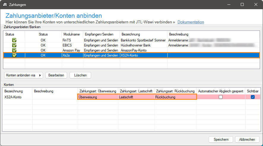 - Sie gelangen zurück zum Dialogfenster Zahlungsanbieter/Konten anbinden. Wählen Sie in der Tabelle Zahlungsanbieter/Banken das Bankkonto aus, das Sie via XS2A angebunden haben.
