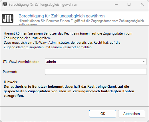 - Wählen Sie im neuen Dialogfenster Berechtigung für Zahlungsabgleich gewähren im Dropdown-Menü JTL-Wawi Administrator Ihren Benutzernamen aus.