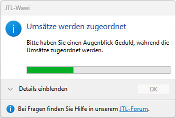 - Der Zahlungsabgleich wird automatisch gestartet. Sie sehen in einem neuen Dialogfenster, dass die Umsätze zugeordnet werden.