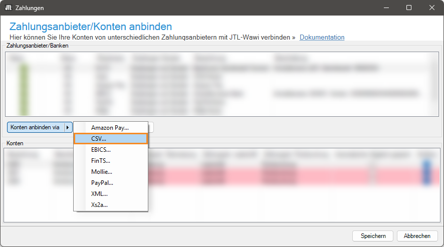 - Öffnen Sie über das Menü Zahlungen > Zahlungsanbieter das Dialogfenster Zahlungsanbieter/Konten anbinden.