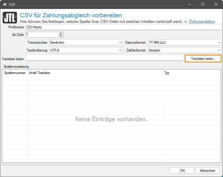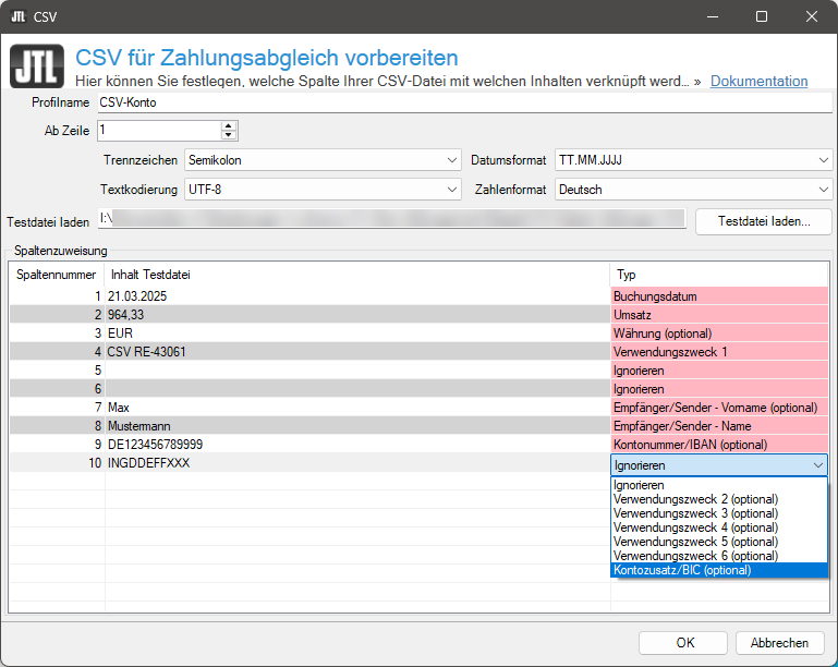 - Klicken Sie auf die Schaltfläche Testdatei laden… und wählen Sie in Ihrer Ordnerstruktur die CSV-Datei Ihrer Bank.