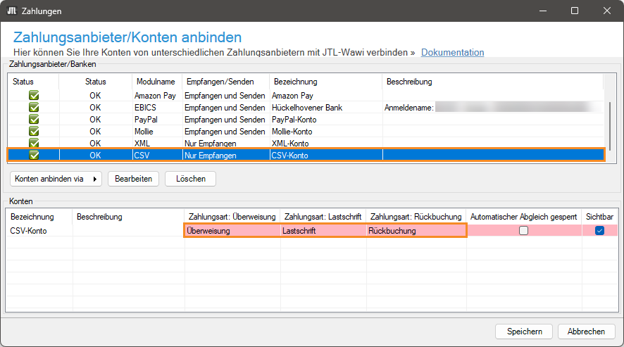 - Sie gelangen zurück zum Dialogfenster Zahlungsanbieter/Konten anbinden. Wählen Sie in der Tabelle Zahlungsanbieter/Banken die Bank, die Sie via CSV angebunden haben.