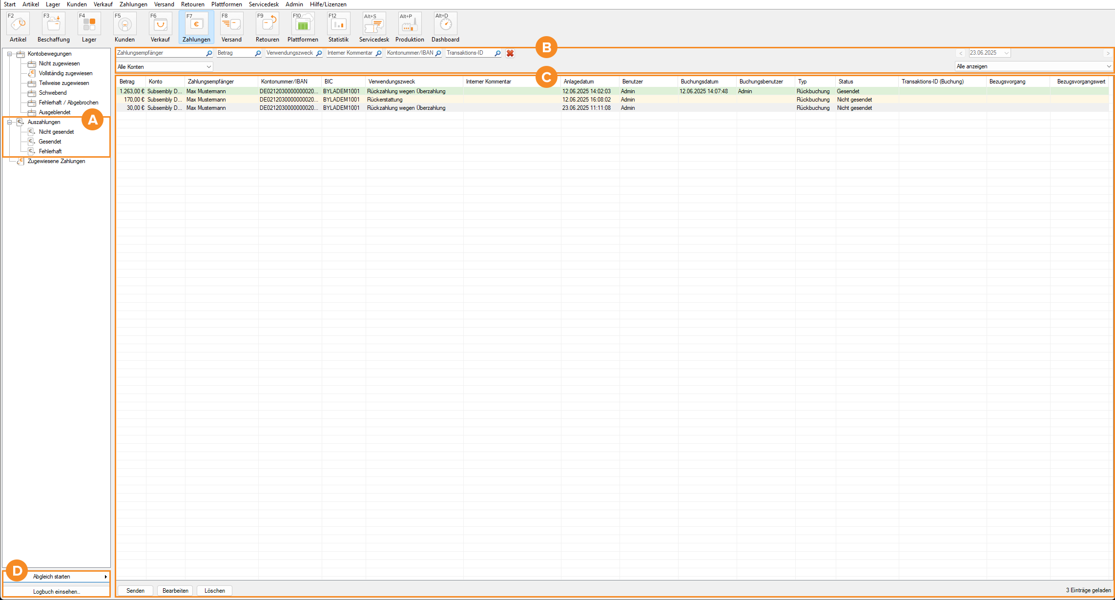 Nicht gesendet: In diesem Ordner befinden sich alle Auszahlungen, die noch nicht an die Bank oder den Zahlungsanbieter gesendet wurden. Diese Auszahlungen sind gelb hinterlegt.