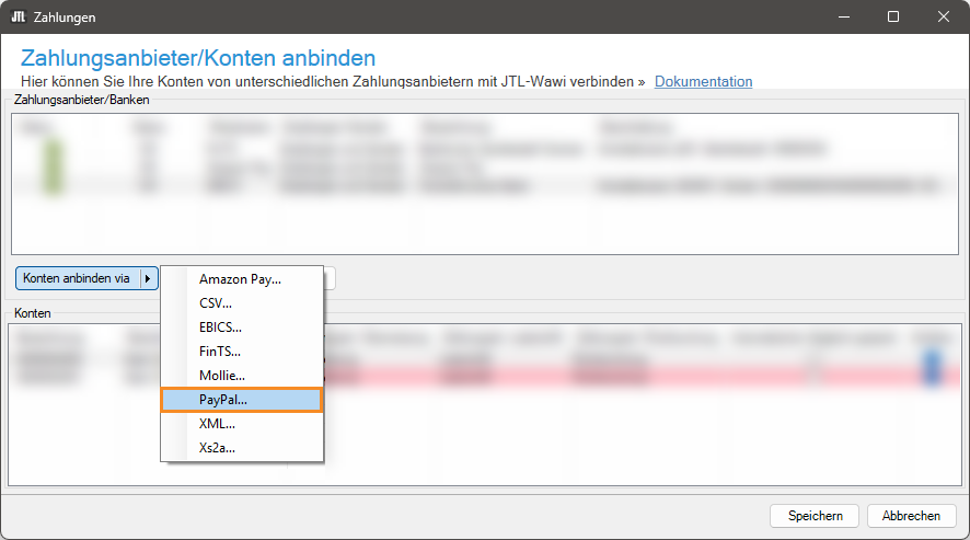 1. Öffnen Sie über das Menü Zahlungen > Zahlungsanbieter das Dialogfenster Zahlungsanbieter/Konten anbinden.