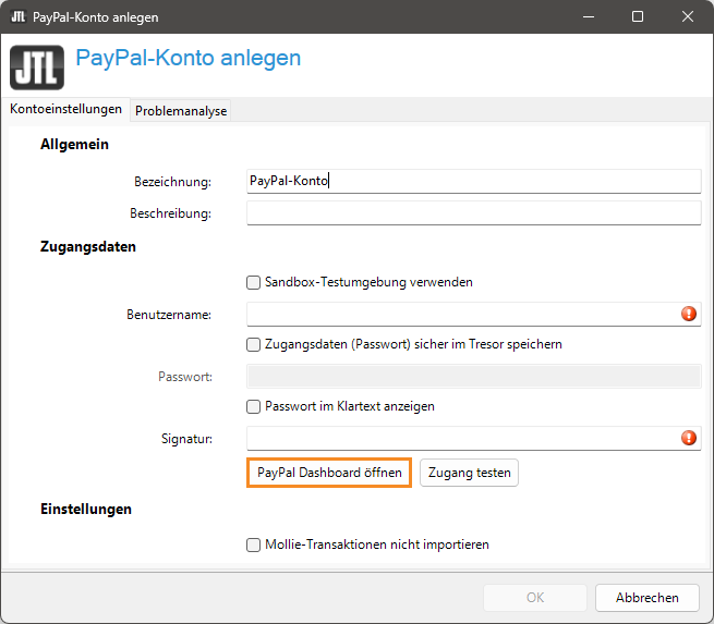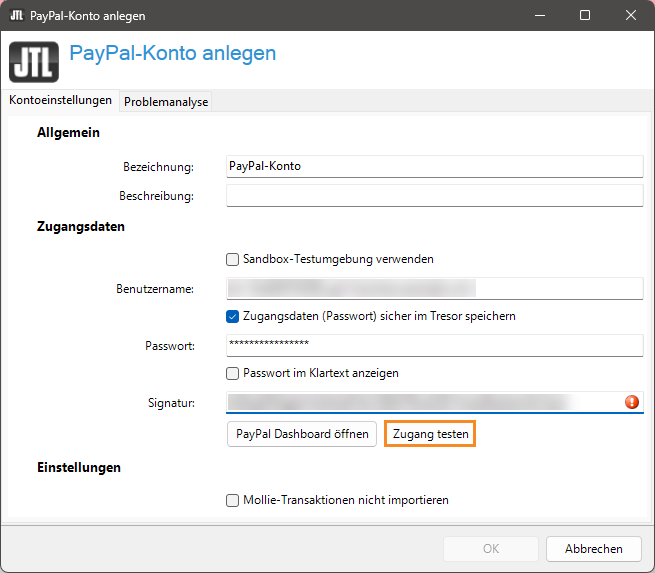4. Gehen Sie zurück zum Dialogfenster PayPal-Konto anlegen in JTL-Wawi.