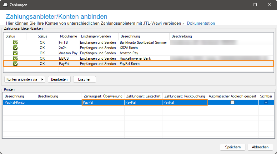 3. Sie gelangen zurück zum Dialogfenster Zahlungsanbieter/Konten anbinden. Wählen Sie in der Tabelle Zahlungsanbieter/Banken den Zahlungsanbieter PayPal aus.