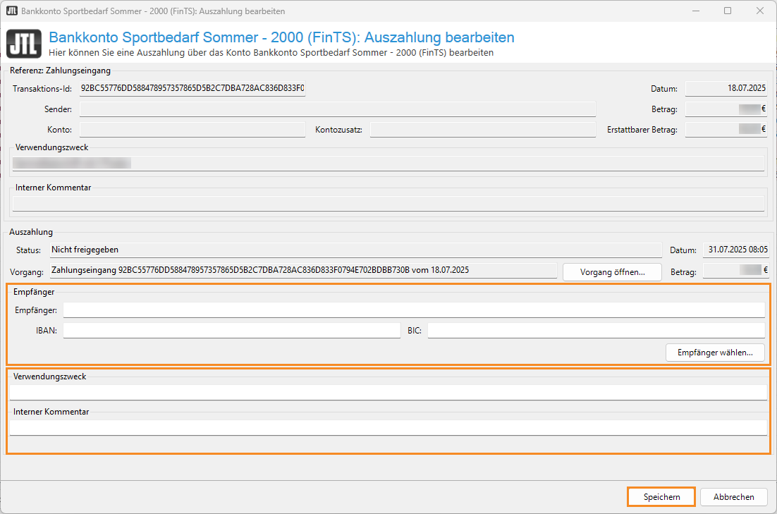 - Überprüfen und passen Sie bei Bedarf im neuen Dialogfenster Auszahlung bearbeiten die Kontodaten des Empfängers und den Verwendungszweck an. Sie können außerdem einen internen Kommentar hinterlegen, der nur in JTL-Wawi sichtbar ist.