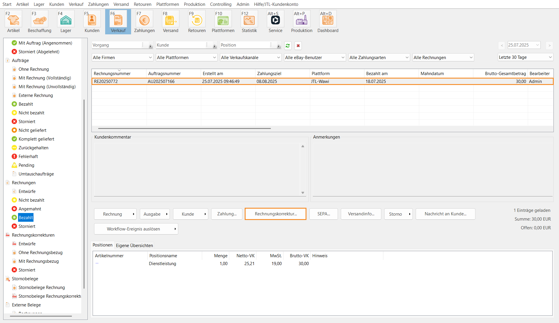 - Markieren Sie die Rechnungskorrektur in der Tabelle.