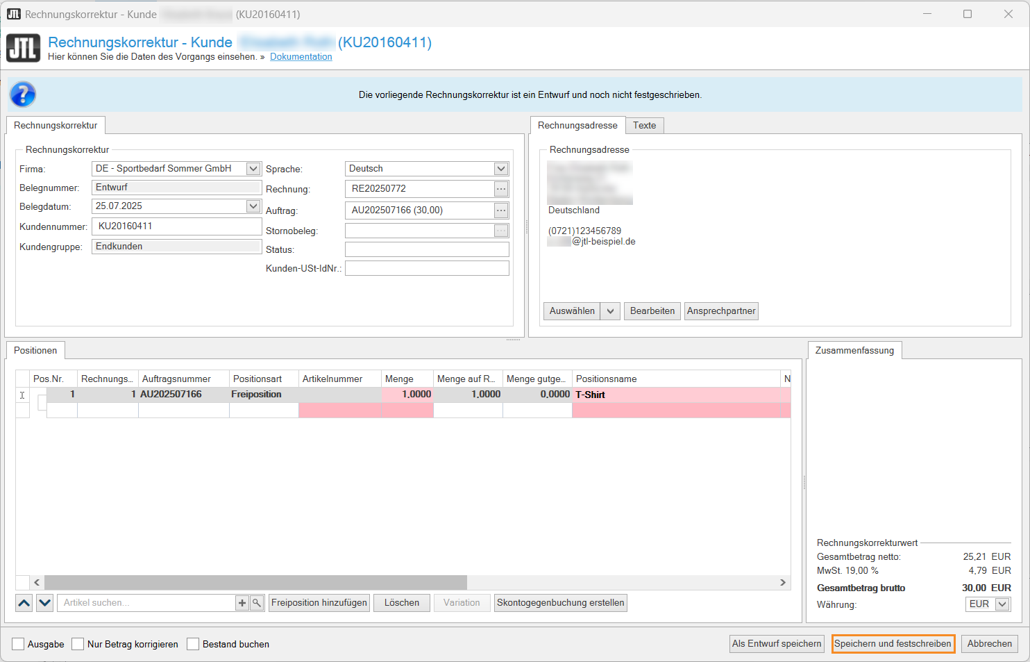 - Überprüfen Sie im neuen Dialogfenster Rechnungskorrektur im Bereich Positionen die bestellten Artikel der Rechnung.