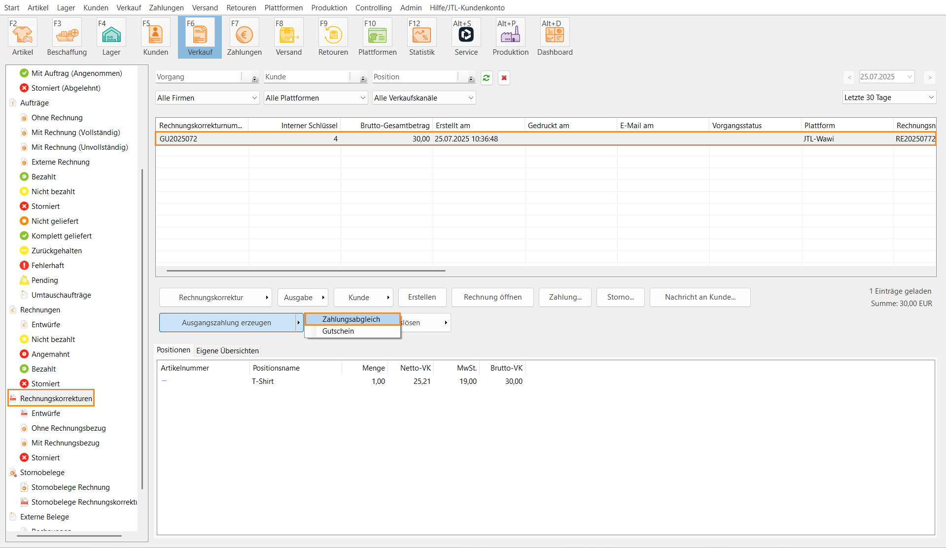 Sie haben erfolgreich eine Rechnungskorrektur erstellt. So erzeugen Sie die Ausgangszahlung zu der Rechnungskorrektur: