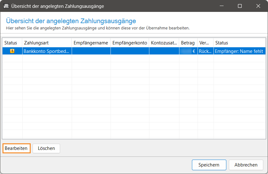 - Im neuen Dialogfenster Übersicht der angelegten Zahlungsausgänge sehen Sie den angelegten Zahlungsausgang. Die Zahlungsdaten können bereits vorausgefüllt sein mit den Daten der zugewiesenen Eingangszahlung des Kunden. Markieren Sie den Zahlungsausgang und klicken Sie auf die Schaltfläche Bearbeiten, um die Zahlungsdaten zu überprüfen und bei Bedarf anzupassen.