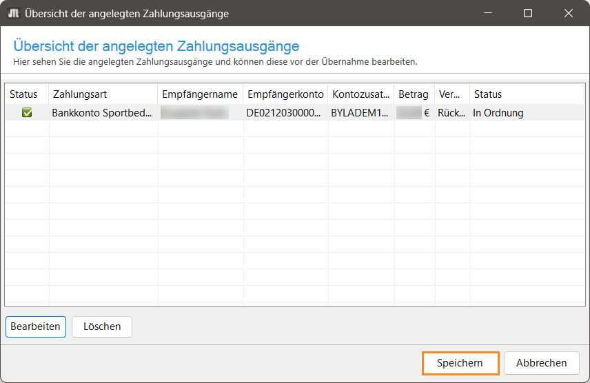 - Sie gelangen zurück zum Dialogfenster Übersicht der angelegten Zahlungsausgänge. Es kann einen Moment dauern, bis die geänderten Zahlungsdaten aktualisiert sind. Wenn alles in Ordnung ist, sehen Sie in der Spalte Status einen grünen Haken. Klicken Sie auf die Schaltfläche Speichern.