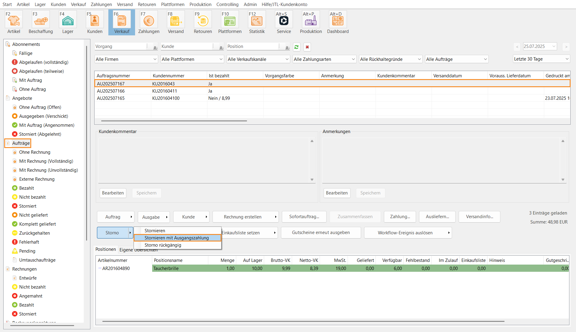 So stornieren Sie einen Auftrag und erzeugen eine Ausgangszahlung: