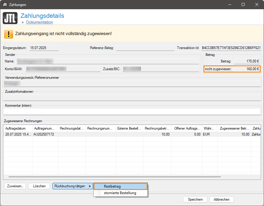 - Im neuen Dialogfenster Zahlungsdetails sehen Sie im Bereich Betrag den nicht zugewiesenen Betrag der Zahlung. Klicken Sie auf die Schaltfläche Rückbuchung tätigen (Pfeiltaste) und wählen Sie die Option Restbetrag.