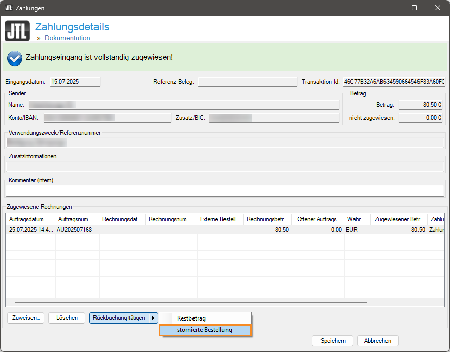 - Klicken Sie im neuen Dialogfenster Zahlungsdetails auf die Schaltfläche Rückbuchung tätigen (Pfeiltaste) und wählen Sie die Option stornierte Bestellung.